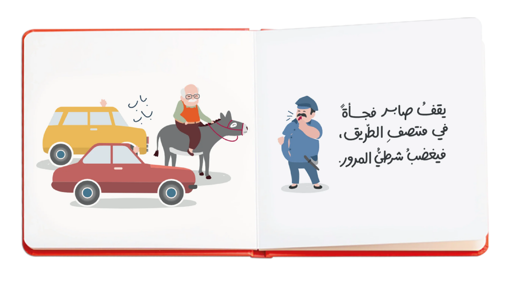 صابر حكاية فكاهية عن حمار عنيد ومضحك يفعل ما يشاء أينما شاء، كالمشي عكس السير والتوقف في منتصف الطريق. تهدف القصة لخلق حوار عن حاجة كل من للانتماء إلى بيئته وعائلته ومحيطه، وعن التصرفات اللائقة وغير اللائقة بالإضافة الى قوانين السلامة على الطريق وذلك بطريقة سرد مبسطة ورسوم مرحة وسهلة